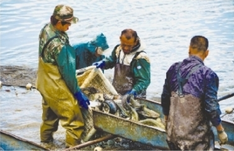 柳条寨镇南李大人村鱼塘捕捞作业现场。