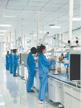 辽宁圣德华星化工有限公司化验室内,化验员正在检验产品。